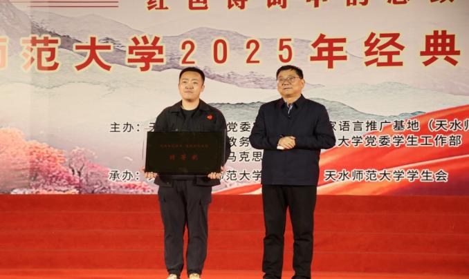 9月29日晚,由党委宣传部、教务处、党委学生工作部、校语委、马克思主义学院、校团委、学生会联合举办的天水师范大学“传诵红色经典 赓续红色血脉”——红色诗词中的思政课暨首届经典诗文诵读大赛在文化广场举行。各参赛队伍各展所长,或激昂高亢、或温婉深情,通过诵读红色经典诗词传递信仰力量。经过激烈角逐,音乐舞蹈学院2025级新生组成的参赛团队凭借“诵读+合唱+舞蹈”的创新演绎、饱满真挚的情感表达与扎实的专业艺术功底,从全校17个参赛学院中脱颖而出,最终拔得头筹,荣获特等奖、优秀组织奖。