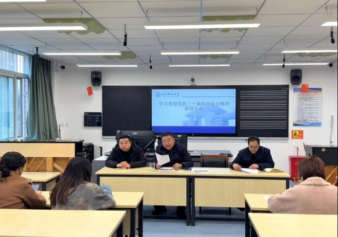 12月18日,为深入学习领会、全面准确把握党的二十届四中全会精神的丰富内涵与核心要义,切实将全院师生的思想和行动统一到党中央决策部署上来,学院党总支书记谢克在213教师宣讲党的二十届四中全会精神。